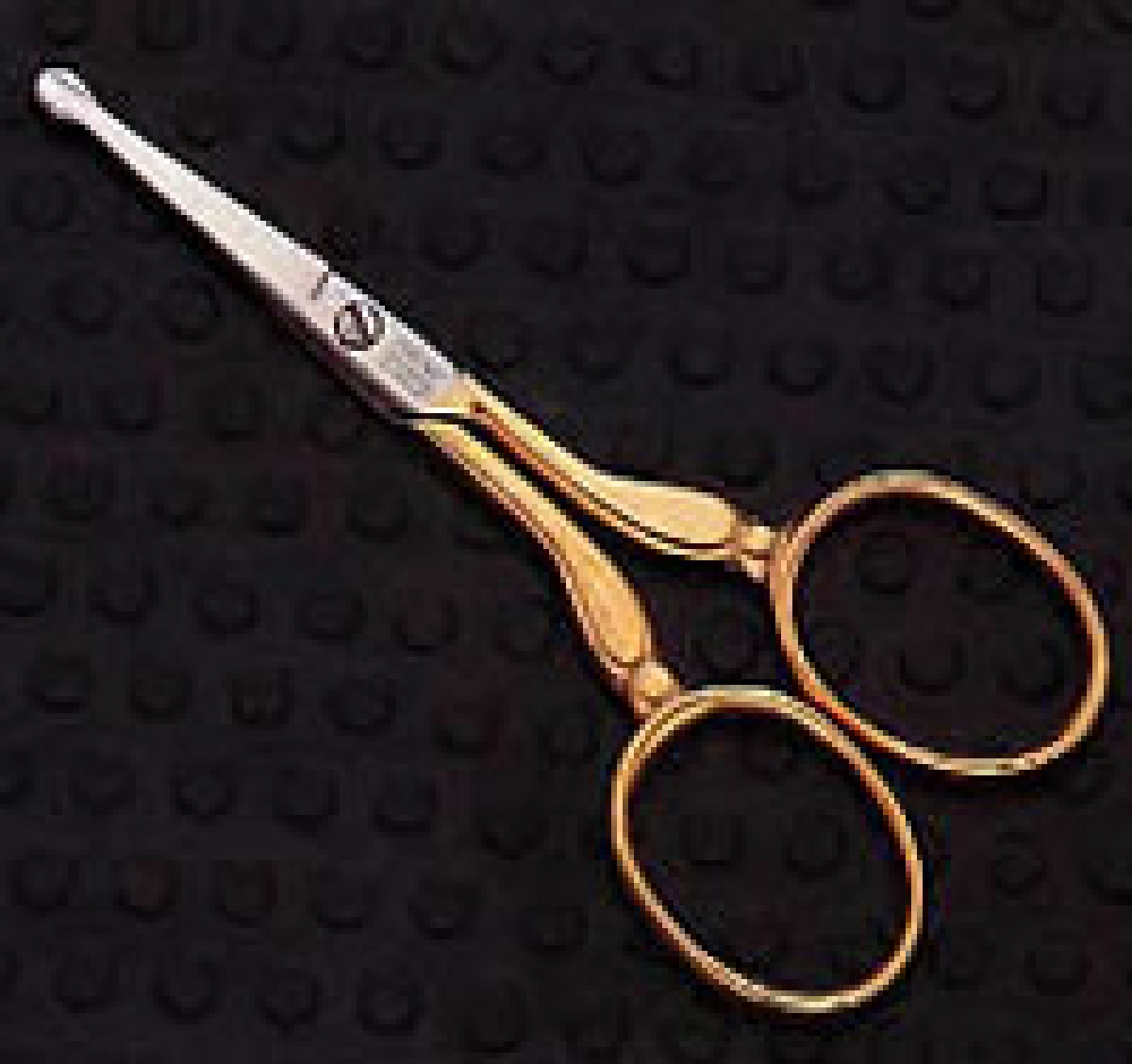 Karina (former distributor) Nose Safety Scissor|Solingen (manufacturer) 3-1/2 Nose / Safety Scissors|Model 867|High carbon steel is hot-drop forged and tempered for exceptional strength, The cutting edge is hand sharped and carefully aligned. The final product is polished and tested for precision cutting to the highest standard.|Superior Quality & Craftsmanship|* Hot Forged Tempered Steel|* Hand Honed Cutting Edge|* Gold Plated